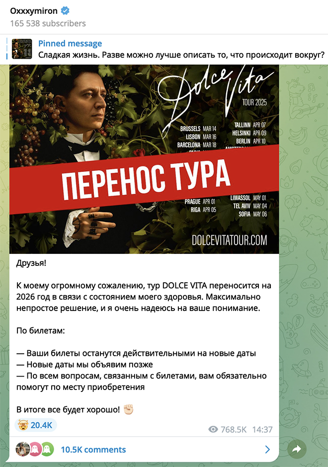 Про то, зачем им нужен Оксимирон, Настя не уточнила, а я не спросил. Поэтому не увидел связи, когда через 3 час после нашей переписки в соцсетях Мирона вышло сообщение, с которого начинается этот текст.
