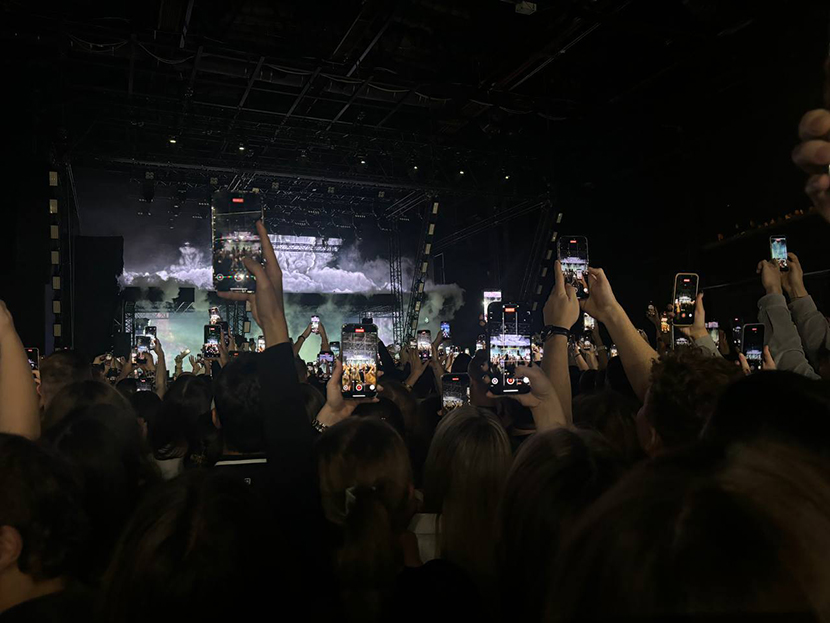 Концерт начался, Айсгергерт в компании балерин появился на сцене. Лес рук с телефонами тут же устремился ввысь и редел только когда играли менее хайповые песни. После первого же трека Жора начал прерываться на благодарности: "спасибо" прилетело родственникам слушателей, неким "нашим руководителям", людям из структур и "всем, кто двигается порядочно". "Спасибо, дамы из Газгольдера, которые возвращают мою музыку на площадки" — так звучал заключительный Жорин респект.