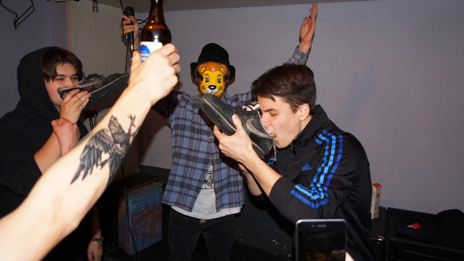 В первом туре мы брили людей под трек “Человек-яйца”, это как-то сначала закрепилось и старались весь тур это соблюдать. А в “Туре выходного дня” придумалось пить пиво из кроссовок. Это тоже сразу вошло в традицию, причем началось с моих кроссовок. В которых я тогда выступал каждый концерт. И вот все эти перформансы как снежный ком накапливались.