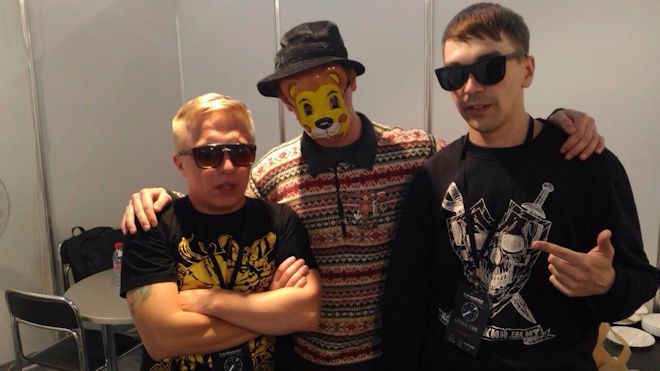 А еще со Славой и его друзьями много тусил: Ежемесячными и ребятами со СловоСПБ. А у Славы же тогда начались все эти движения. Его позвали на Вейп-экспо как автора трека “Вейп-вейп-вейп”, ну и он меня подтянул. А там с ним АК-47 выступали — сидели в соседней гримерке. И я тогда тоже не удержался, конечно, у меня маска была с собой — сфоткались в итоге.