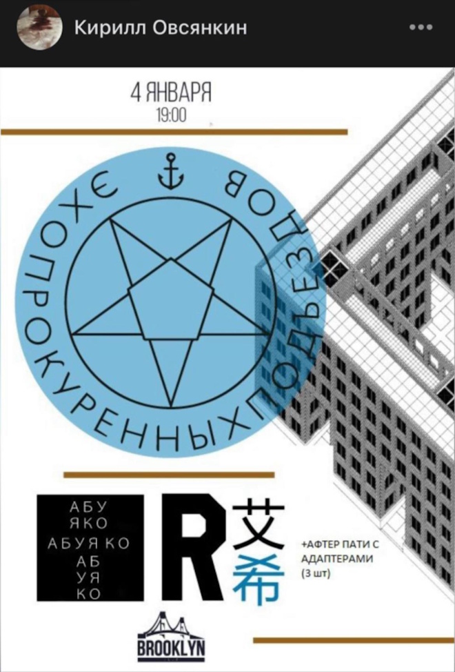 — Мне Виктор СД предложил тогда съездить на концерт Биг Рашн Босса. А я на тот момент вообще ни разу не бывал в таких гримерках больших. Не знал, что туда приходит настолько овердохуя неожиданных персонажей. И когда увидел Яникса, говорю Вите: “Блять, мне обязательно надо с ним сфоткаться”. Отошел надеть маску, свитер и шляпу, а потом подхожу к Яниксу: “Бро, можно с тобой сфоткаться?”. И разговорились с ним. Стояли с ним и Витей, обсуждали панк-музыку.