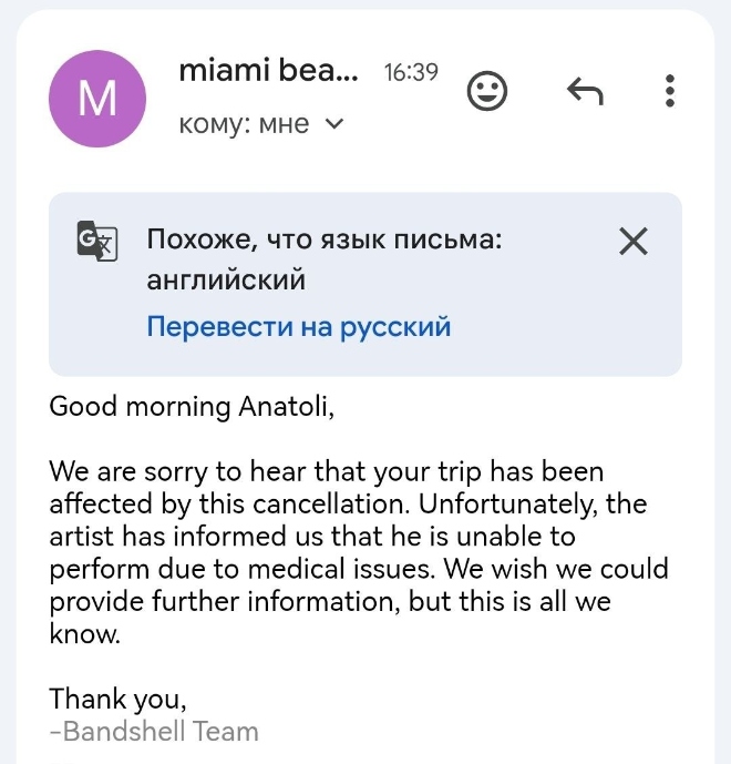 Зрители, купившие билеты, получили от площадки объяснение по электронной почте, что концерт не состоится из-за состояния здоровья артиста:
