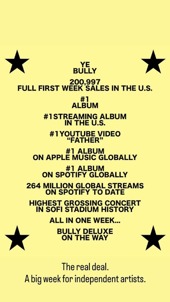 Лейбл Gamma намекнул на скорый выход делюкс-версии альбома Канье Уэста “Bully” — в соцсетях появился пост с подписью “Buly Deluxe on the way”.