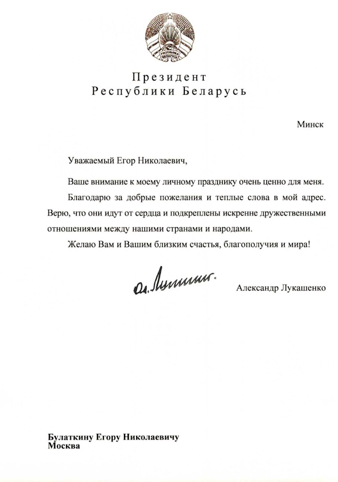 Александр Лукашенко направил Егору Криду официальную благодарность: “Уважаемый Егор Николаевич, ваше внимание к моему личному празднику очень ценно для меня. Благодарю за добрые пожелания и теплые слова в мой адрес. Верю, что они идут от сердца и подкреплены искренне дружественными отношениями между нашими странами и народами. Желаю Вам и Вашим близким счастья, благополучия и мира!”.