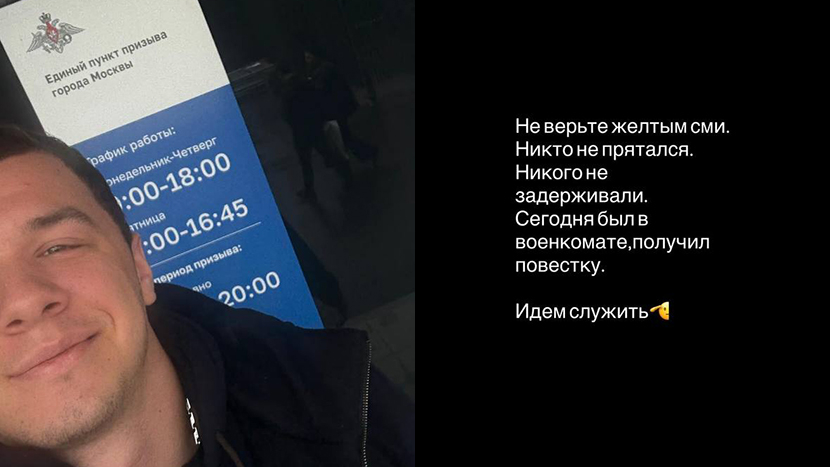 Macan выложил в сторис селфи на фоне таблички "Единый пункт призыва города Москвы". В следующей сторис он написал, что сходил в военкомат и получил повестку.