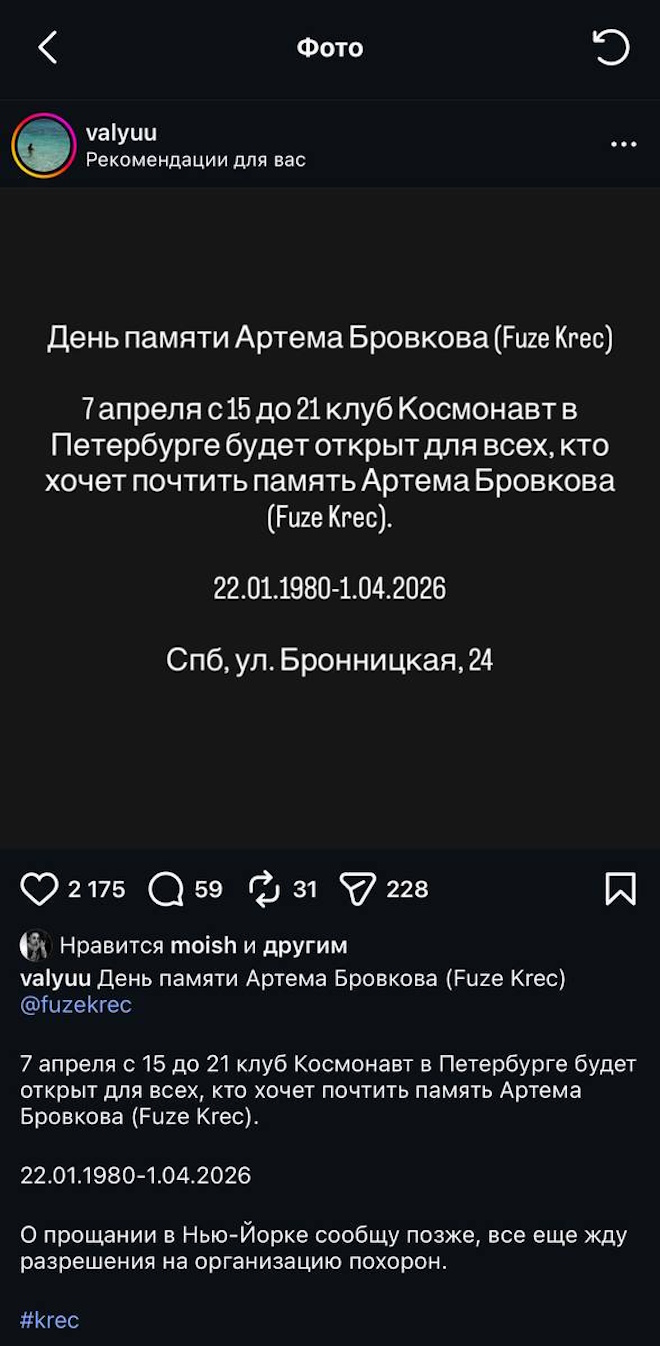 Прощание пройдет 7 апреля с 15:00 до 21:00 в клубе “Космонавт” в Санкт-Петербурге. Информация о прощании в Нью-Йорке появится позже — сейчас семья ожидает разрешения на организацию похорон.