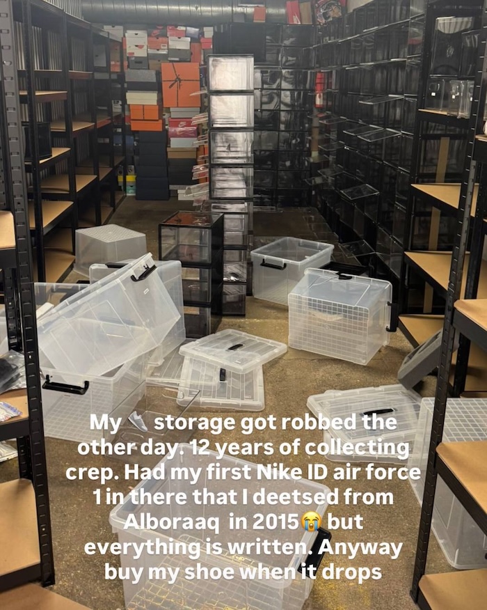 (Мой склад ограбили. Там были вещи, которые я собирал 12 лет. Там хранились мои первые NIKE ID Air Force 1 из 2015-го, но на все воля божья. В общем покупайте мою обувь, когда она поступит в продажу)